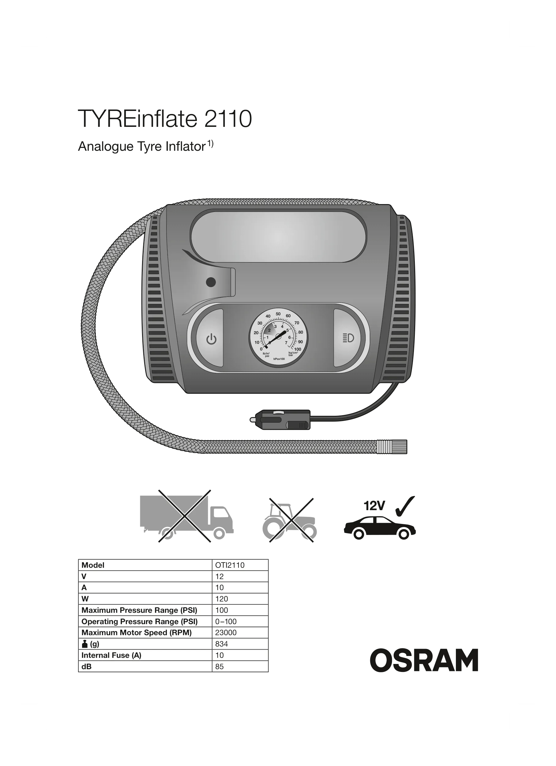 Der OSRAM TYREinflate 2110 ist die Kombination aus Einfachheit und Leistung für ein müheloses Aufpumpen von Reifen. Dieser fortschrittliche Reifenfüller verfügt über ein großes, leicht ablesbares analoges Manometer, das jedes Mal präzise Druckwerte liefert. Das aufrollbare 3 m lange 12V-Stromkabel ermöglicht ein schnelles und ordentliches Verstauen, während die integrierte. Ventilaufbewahrung dafür sorgt, dass die Ventilkappen während des Gebrauchs geschützt bleiben.