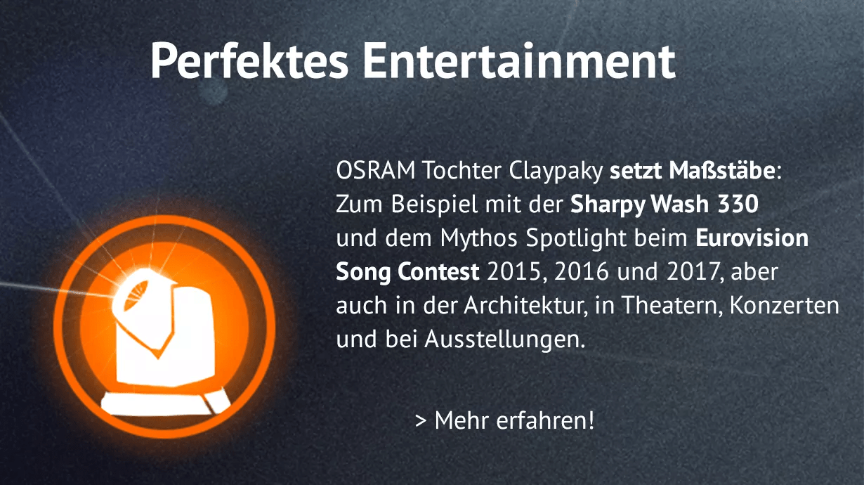 Mehr als 40 Jahre Erfahrung, gepaart mit breitem technologischen Know-How, haben OSRAM im Bereich der Entertainmentbeleuchtung zu einem der Pioniere gemacht. OSRAM-Technologie begeistert Tag für Tag Konzertbesucher mit atemberaubenden Lichtspektakeln, ist in TV-Studios präsent, findet sich weltweit in Kinoprojektoren oder kommt in der Flugfeldbeleuchtung zum Einsatz.