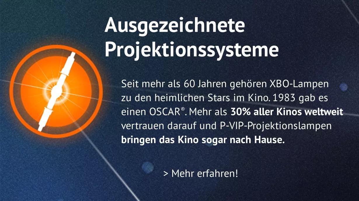 Seit nunmehr 60 Jahren überzeugen OSRAM XBO-Kinolampen mit hohem Lichtoutput, geringem Lichtverlust über die gesamte Lebensdauer und optimaler Tageslichtfarbtemperatur. Für diese Projektionslampen wurde OSRAM 1983 sogar mit einem Oscar® ausgezeichnet.